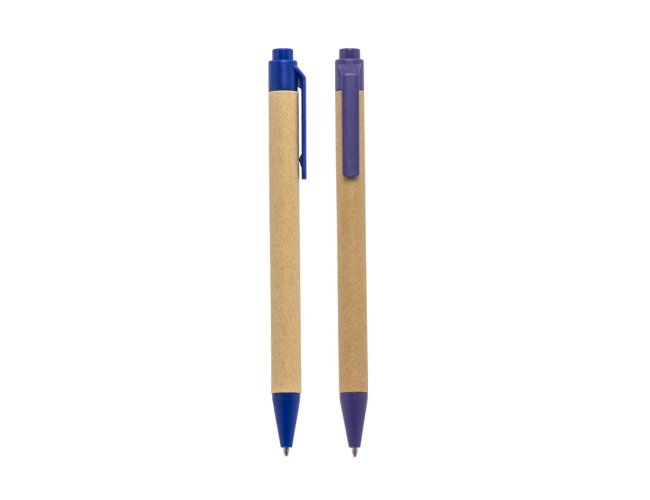 Caneta de papelão com detalhes plásticos, carga esferográfica azul e acionamento por clique.
